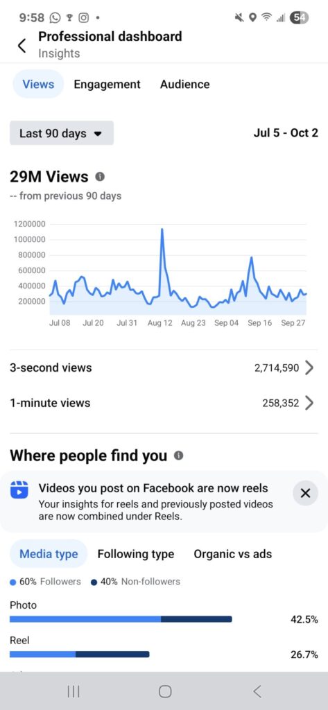 - Audience mix: 60% followers vs. 40% non-followers, meaning content continues to attract fresh eyes beyond the core base.