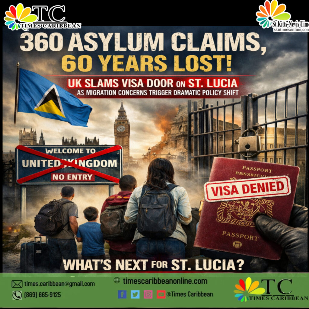 TIMES CARIBBEAN — A total of 360 asylum claims has triggered a dramatic diplomatic rupture between St. Lucia and the United Kingdom, abruptly ending six decades of visa-free travel and raising serious questions about migration patterns and oversight linked to the island’s Citizenship by Investment (CBI) programme.