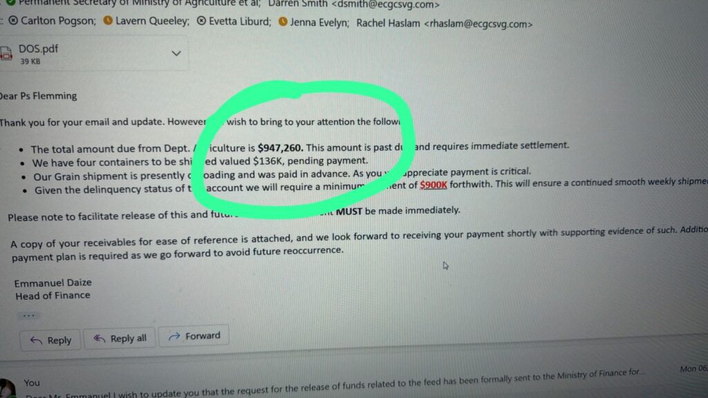 A whistleblower inside the Ministry provided documents showing that the St. Vincent–based supplier issued an urgent demand for immediate settlement of EC $947,260 in overdue balances, along with an additional shipment valued at $136,000 pending payment, pushing the total exposure to over $1 million. The supplier further warned that no future grain shipments would be guaranteed unless a minimum payment of $900,000 was paid forthwith, citing the “delinquency status” of the account.