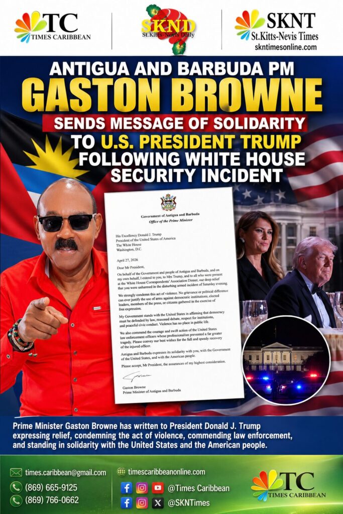 ST. JOHN’S, Antigua and Barbuda (Times Caribbean) — Prime Minister of Antigua and Barbuda, Hon. Gaston Browne, has formally written to United States President Donald J. Trump expressing relief that he was unharmed following what was described as a disturbing armed incident during Saturday evening’s White House Correspondents’ Association Dinner.
