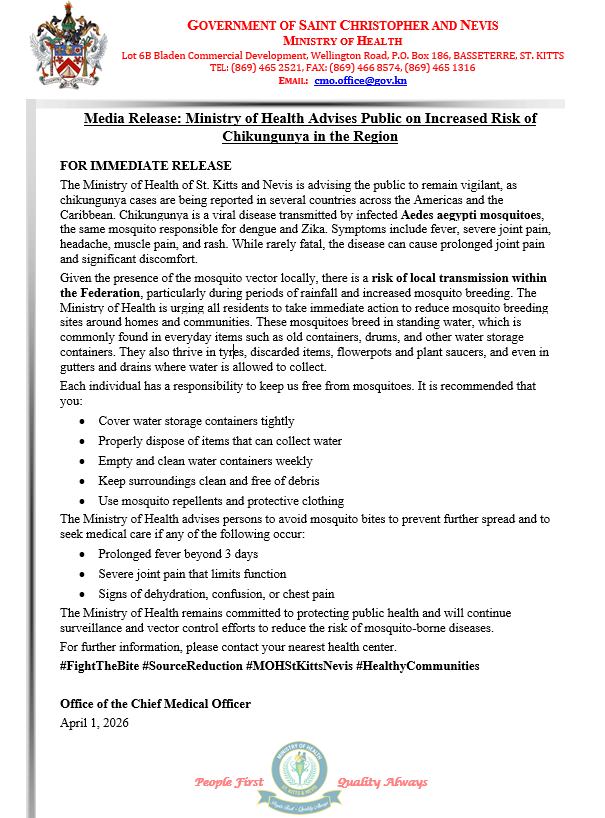 BASSETERRE, ST. KITTS — A chilling regional health alert is now casting a long shadow over Saint Kitts and Nevis, as the Ministry of Health warns that chikungunya cases are spreading across the region—and the Federation is dangerously exposed.