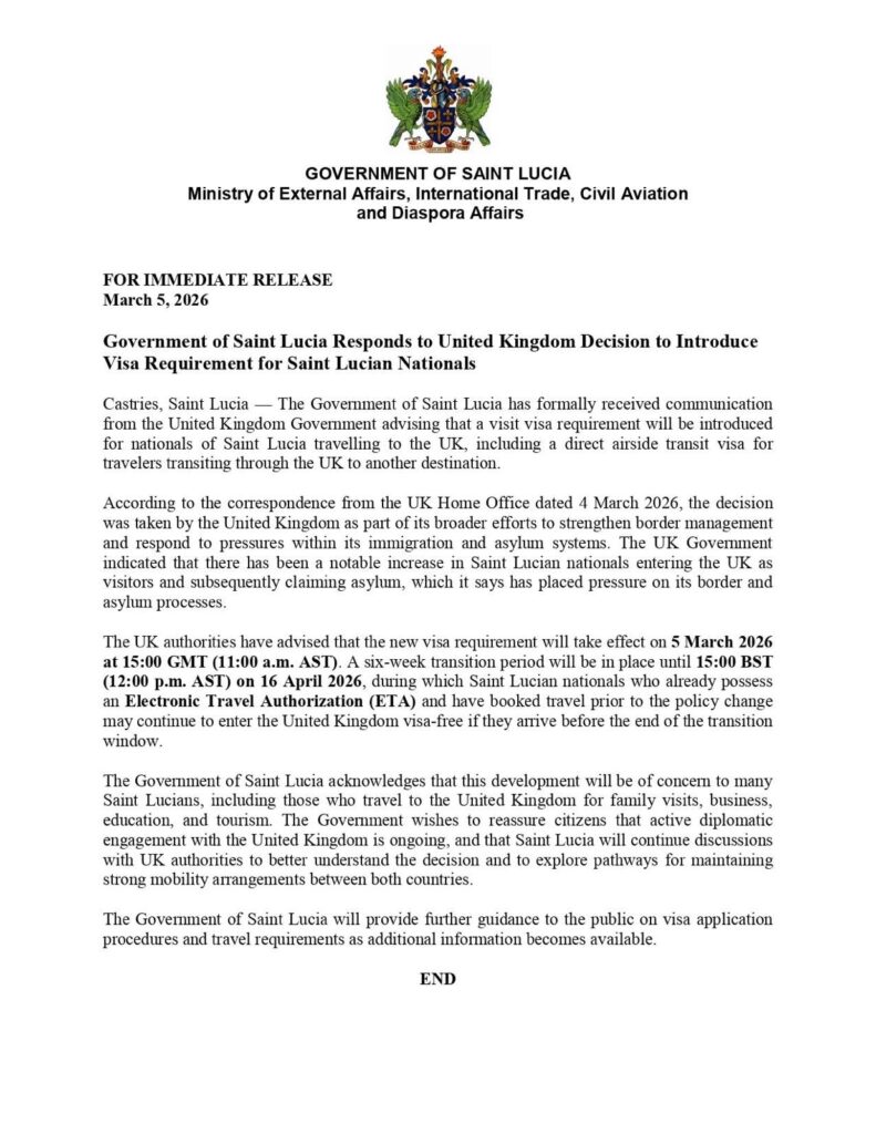 According to the correspondence from the UK Home Office dated 4 March 2026, the decision was taken by the United Kingdom as part of its broader efforts to strengthen border management and respond to pressures within its immigration and asylum systems. The UK Government indicated that there has been a notable increase in Saint Lucian nationals entering the UK as visitors and subsequently claiming asylum, which it says has placed pressure on its border and asylum processes.
